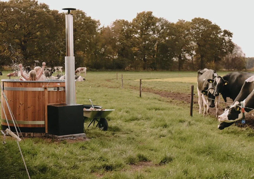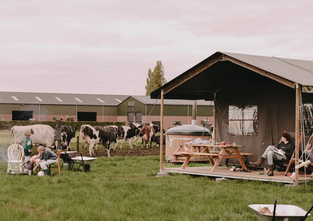 Achter op het erf staan vijf ruime tenthuisjes, waarvan één met een hottub. Vanuit elk tenthuisje heb je uitzicht over de weilanden tot aan de bosrand en sta je binnen enkele stappen tussen de koeien. In de boerderijwinkel vind je huisgemaakte producten zoals kaas, yoghurt, vlees en verse eieren. Bij de melktap tap je melk rechtstreeks van de koe. Een geliefde plek, ook voor de lokale bewoners.