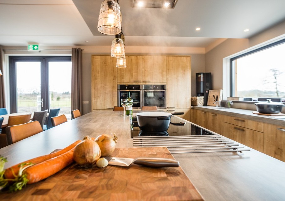 Op het boerderij-erf staat een prachtig, luxe groepshotel, waar je met 20 – 40 personen kunt overnachten, indien gewenst met catering. Maar dat is niet noodzakelijk. Want het groepshotel beschikt over een grote gezelschapsruimte voorzien van een royale open keuken met kookeiland, twee ovens, twee koelkasten, twee vaatwassers èn een mobiele biertap! Ook vind je er een ruime zit- en eethoek en een sfeervolle open haard. Verder beschikt het hotel over een infrarood sauna.