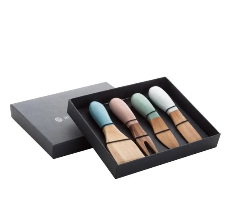 4 delige kaasmessenset met bamboe handvat, in zwarte geschenkverpakking. 185×30×160 mm.